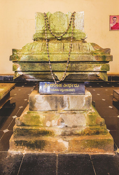 Parking and ATM facility are also available to devotees. In the middle, there is office wing, open Sabhamandira, Poojamandira, rooms, kitchen, wells, dining hall etc. The names of two wells are Antaraganga and Sheetalaganga. At lower stage, there is holy pond namely Dhavalatirtha. Around this, small temples of Chandra-mouleshwara, Veenapani Hanuman, Veeranjaneya, Venu-gopala Krishna and Santanagopala Krishna are situated. Back to Veeranjaneya temple, there are 'Yagashala' and 'Goshala' with required facilities. East to the holy pond, there is a big shrine. Inside the shrine, there are Pancha-Vrindavanas of Sri Vadiraja. On the top of middle Vrindavana, the image of Lord Hayagriva exists. Below that there is the figure of Sri Vadirajaru. In the south, there lies the image of Veenapani Hanuman. In the west, there dwells the figure of Gadapani Bheema. In the north, the image of Sri Madhva shines. In the case of other four Vrindavanas, the Dashavatara figures are well carved. The five Vrindavanas signify the holy presence of five forms of god Vayu and Sri Vadirajaru namely Prana, Apana, Vyana, Udana and Samana. It hints at the fact of equality and parity between the god Vayu and Sri Vadiraja. Infront of Panchavrindavana, the statue of Vedavyasa is found. The pose of statue of Lord Vedavyasa is distinct and peculiar. In both the palms of right and left hands, there are characteristic marks of Chakra and Shankha. Right side, there is the holy Vrindavana of Sri Vedavedyatirtha. Besides that, the stone inscription of Anuvrindavanakhyana is seen. It is the summarised work of Vrindavanakhyana. It was compiled, got inscribed and installed by Sri Vedanidhitirtha. Around the construction there is a corridor for doing Pradakshina (circumambulation). The small shrine of Bhutaraja is found at the right side of corridor. In the east, there is Akhyanamand-ira. The entire sacred text Vrindavanakhyana is sto-ne inscribed in it. It was the unique and instructed Seva rendered by Sri Vishwottamatirtha. Right of it, there is a small pond called Papavimochana-tirtha. Further in the east, the presence of ten holy tombs of seers is seen. There are five Moola Vrindavanas and five Mrittika Vrindavanas.